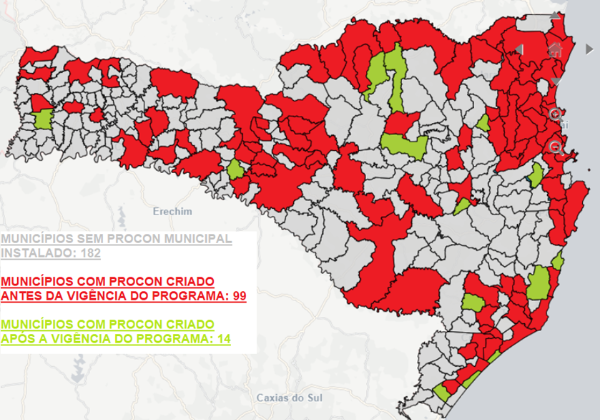 Órgãos de defesa do consumidor municipais criados e estruturados em todos os municípios-sede de Comarca, de modo a possibilitar a tutela administrativa dos consumidores, ampliando o acesso aos serviços de defesa do consumidor à população catarinense.
